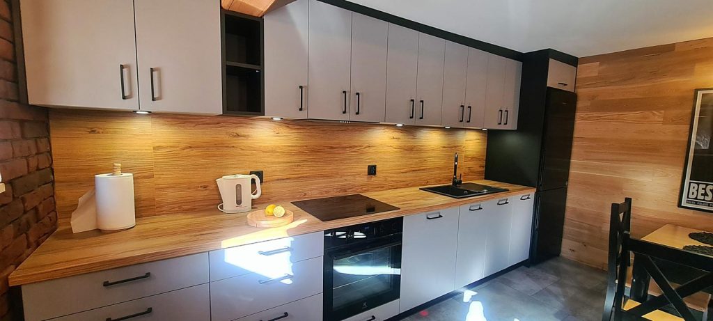Kuchnia z jadalnią, wyposażona w kominek, tworzy przytulną atmosferę do wspólnych posiłków. Znajdziesz tu pełne wyposażenie kuchenne w tym lodówkę, piekarnik, mikrofalówkę, toster, płytę indukcyjną oraz ekspres do kawy co pozwala na przygotowanie zarówno prostych, jak i wyszukanych dań.